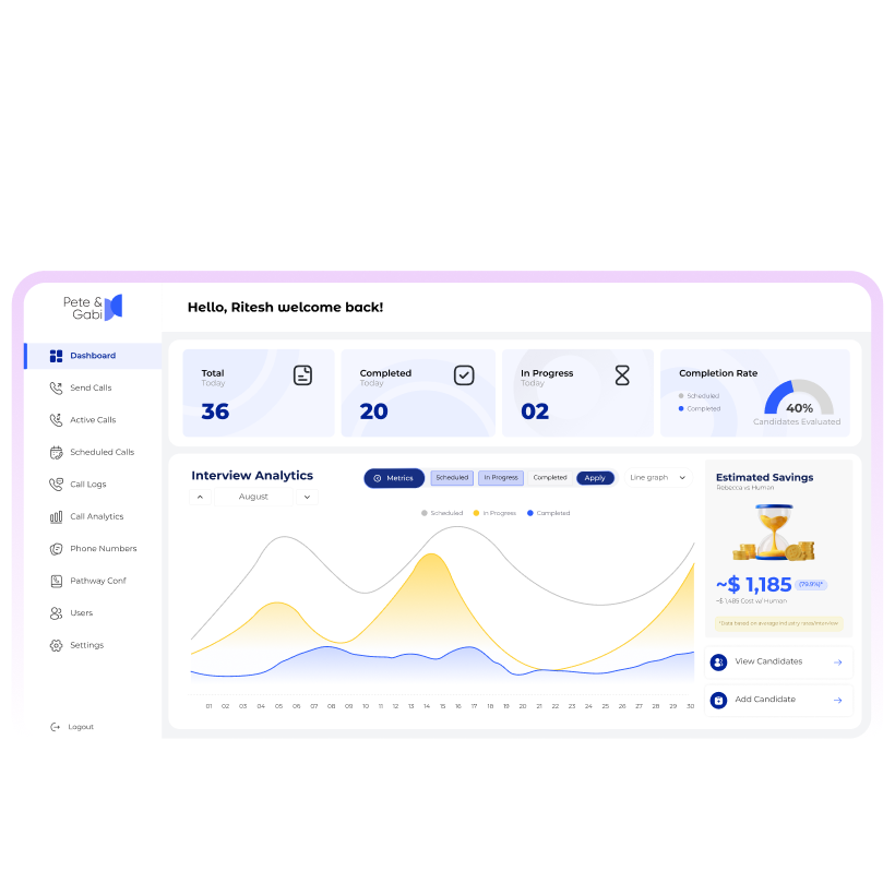 Enterprise recruiting solutions powered by AI are built for large-scale hiring. They automate candidate outreach, pre-qualification, live two-way interviews, role-specific scoring, and ATS sync, so your team receives a qualified shortlist faster.