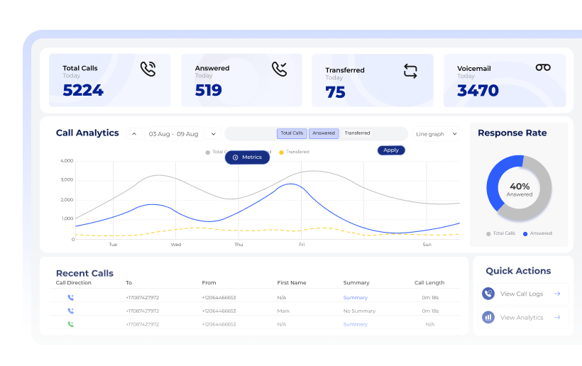 Manage all operations from a unified dashboard. Track the number of calls, responses to your prospects, and AI-generated summary of all of your interactions.