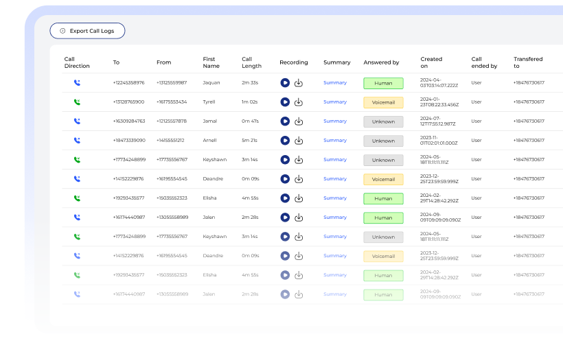 A complete list of your call history, including a summary of every call, the audio recording of every call, and if the call was answered or not, or received your voicemail. You can filter your call logs by date, status, etc., and you can also export your data or track your live transferred calls made by AI sales automation tool.
