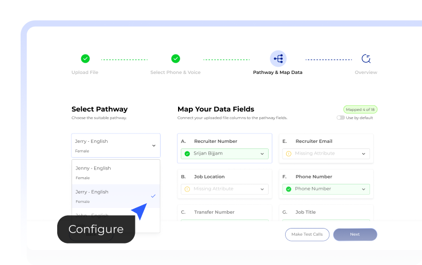 Select your Strategy: General, Acquisition, or Win-back, and the Olivia AI Outbound Calling Software will automatically map your Excel or CSV Spreadsheet Data fields to the required variables. During the configuration process, you can switch back and forth between your custom input variable data and the default variable data.