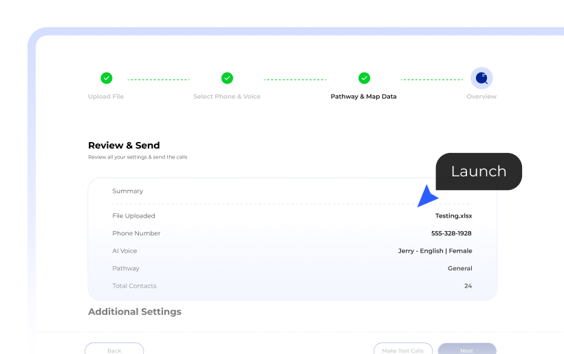 Once the configuration is set up with outbound number, pathway, data to the exact variables, and the CSV or Excel File was processed completely, you will be ready to launch your AI sales platform engine to watch it update your real-time call activity and conversion statistics on the dashboard.
